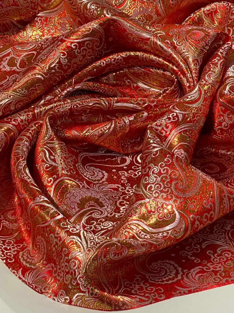 Парча-жаккард - идеальный вариант для создания элегантных, национальных, праздничных и театральных костюмов. Из этой ткани создавали одеяния для торжественных религиозных церемоний и придворных балов. Этот запоминающийся материал добавит шарма и роскоши любому наряду: платье, пиджак, костюм (в том числе новогодний), жакет, аксессуары и другие. Состав 100% полиэстер с метализированной нитью обусловит отличную износостойкость и устойчивость к выгоранию 12288